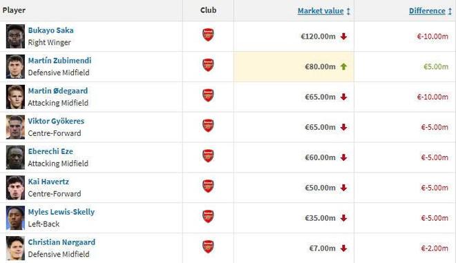 北京时间3月9日,德国转会市场公布了英超球员的最新身价,阿森纳方面共有8名球员身价有变化,其中只有苏比门迪身价上涨,其余7名球员身价均下跌。